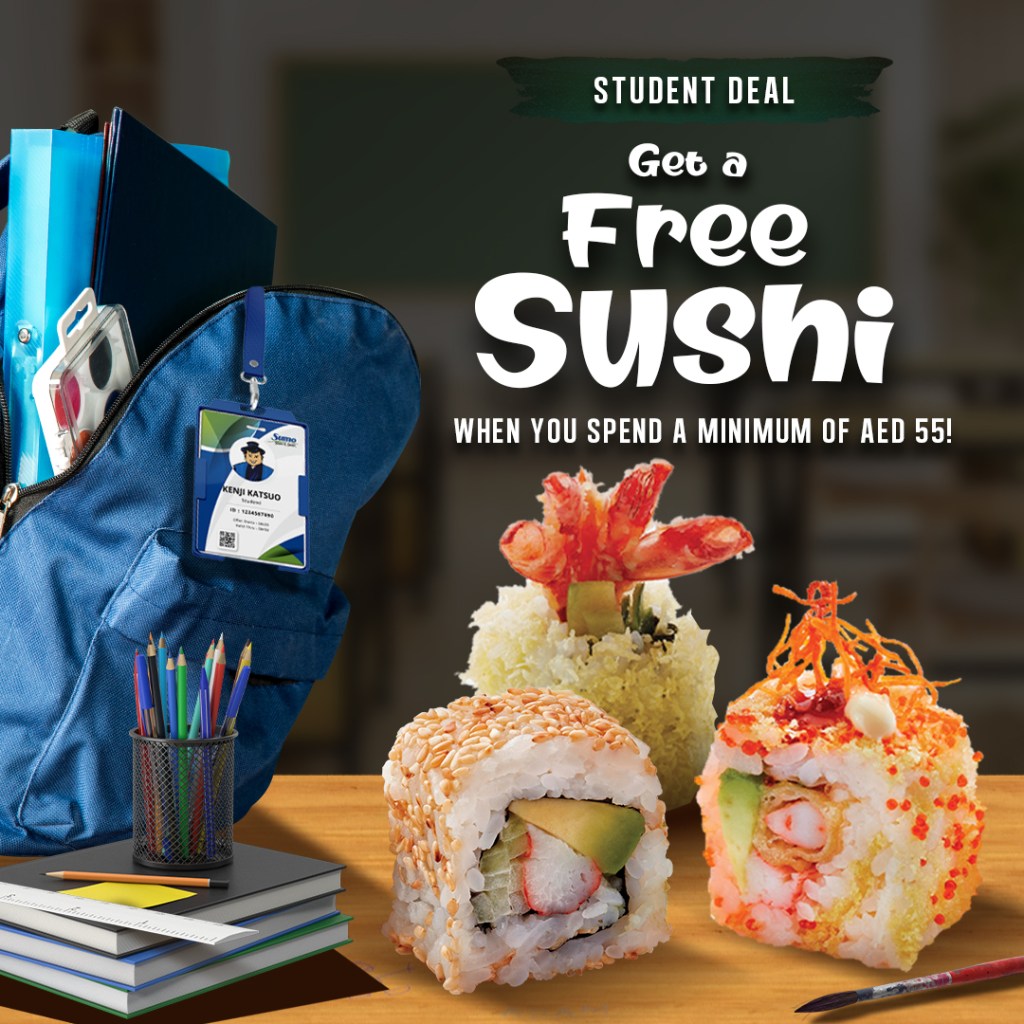 What: Sumo Sushi & Bento has an offer to get a free sushi dish on spending AED 55/- for all students with their new academic school year. Show your ID to avail offer. Free Sushi options include Crunchy Crazy, Sweet Potato Crunch, California.