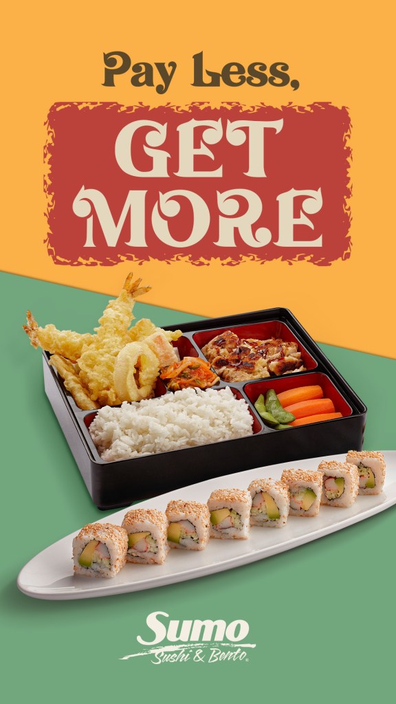 The special offers are available from 11am to 11pm at all Sumo Sushi & Bento outlets. For Booking, visit https://sumosushibento.com, download the Sumo Sushi App or call 800-7866(SUMO)